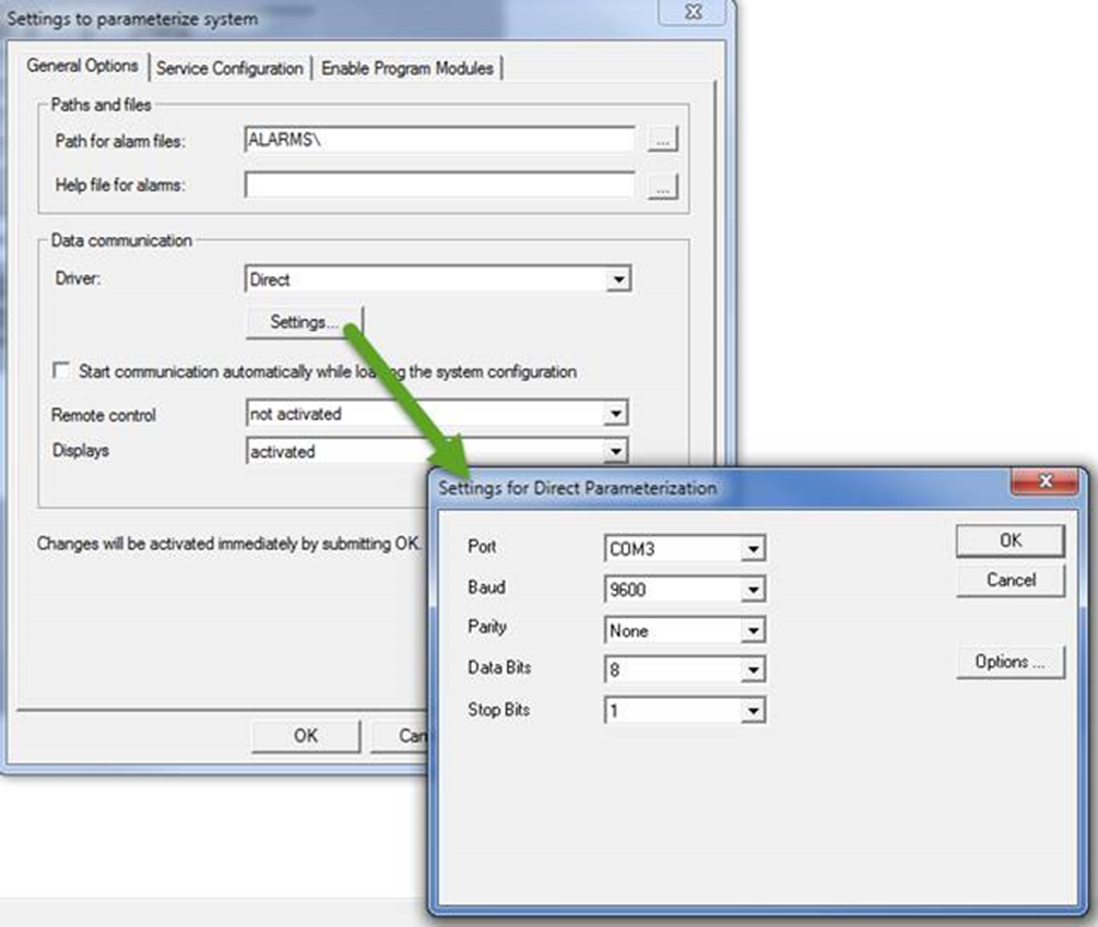 Driver must be set for “Direct”, and appropriate COM-Port assigned/connected to the DPC cable must be selected.Open the respective .cfg file. (“File” ... “Open”)
