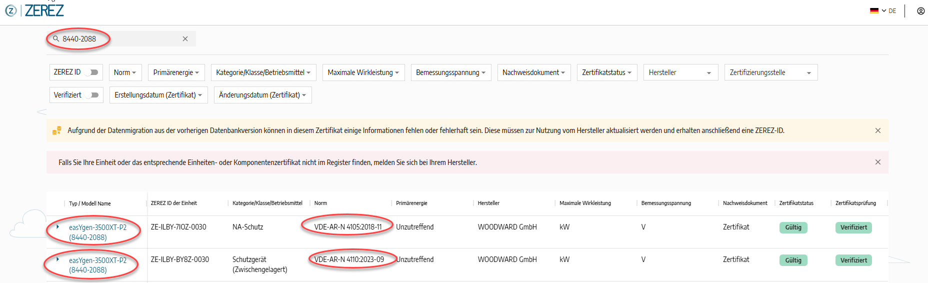 VDE-AR-4105 und 4110 Komponentenzertifikate easYgen-3000XT ZEREZ Datenbank